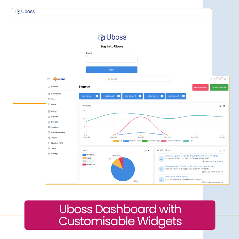 VanillaIP's Uboss is the Partner-first platform that gives resellers complete control over hosted VoIP delivery, from provisioning to billing, all under a white-label experience.
